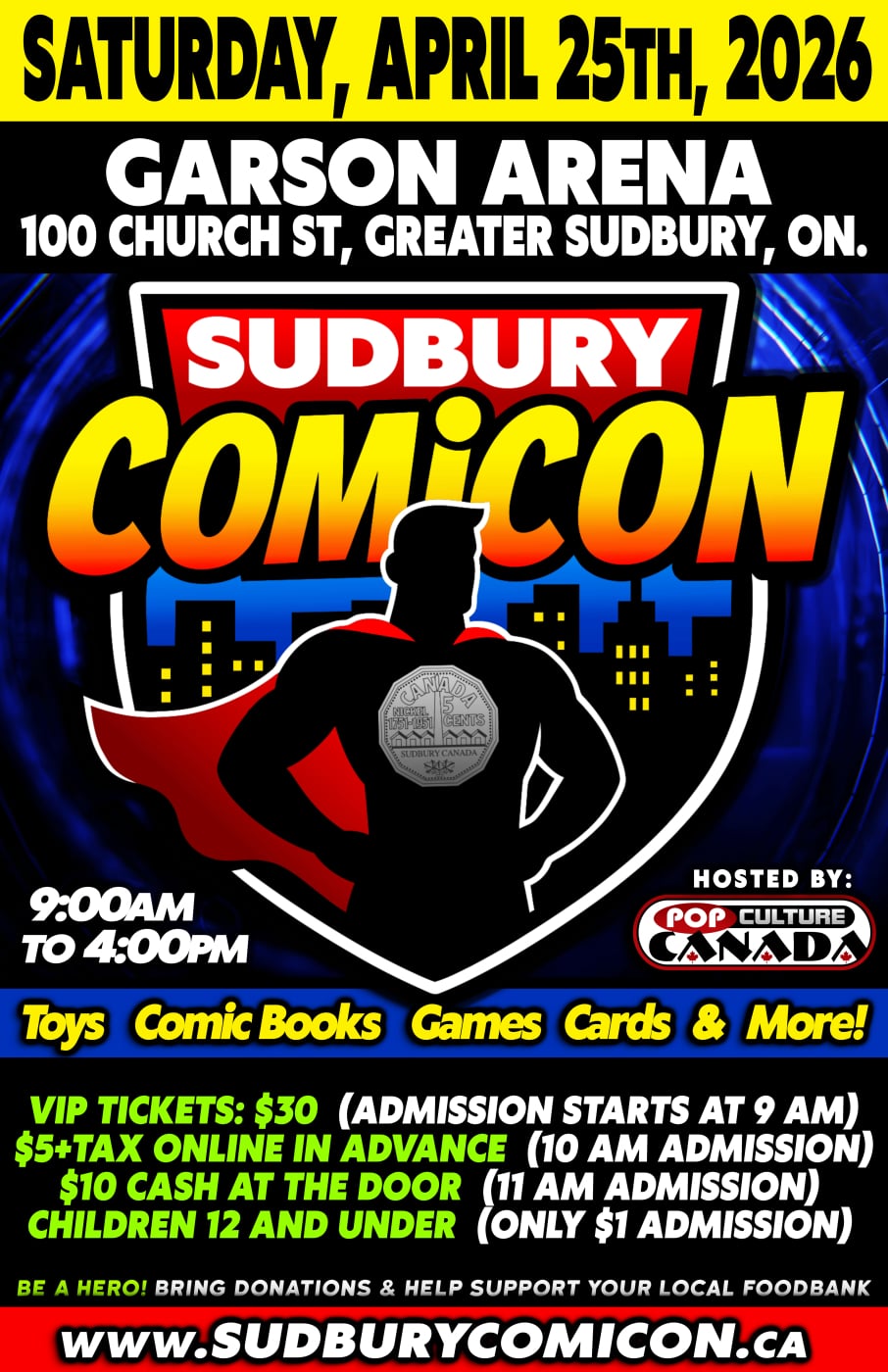Get ready for Sudbury ComiCon 2026, happening on Saturday, April 25th at the Garson Arena in Greater Sudbury, Ontario. From 9 AM to 4 PM, immerse yourself in a world of toys, comic books, games, trading cards, and so much more. Whether you’re a longtime fan or new to the scene, this event offers something for everyone.